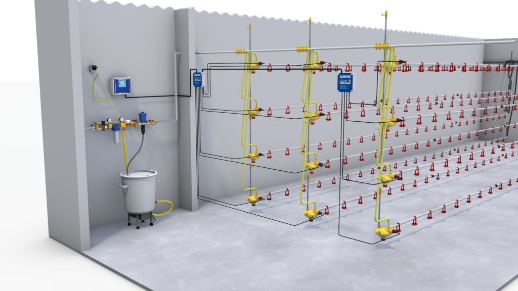 На додаток до промивної сапуни та дренажного комплекту, які необхідні в кінці напівної лінії, дренажна труба* необхідно встановити для автоматичної системи змиву. Іншими необхідними компонентами є регулятор тиску Optima E-Flush і контролер LUBING Touch Control LCW, а також коробки розширення, якщо це необхідно. Додатково доступний температурний комплект (арт. 4488) для залежного від температури промивання та наповнення, а також (лише для нових установок) ультразвукова система очищення LUBING UltraFlush.