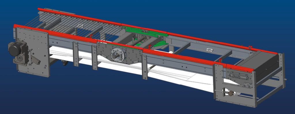 Стрічка для видалення бруду для кривого конвеєра складається з приводу, а також тримачів для пластикової тканинної стрічки та кінцевого блоку. Швидкість стрічки грунтової стрічки становить 3,9 м/хв.
