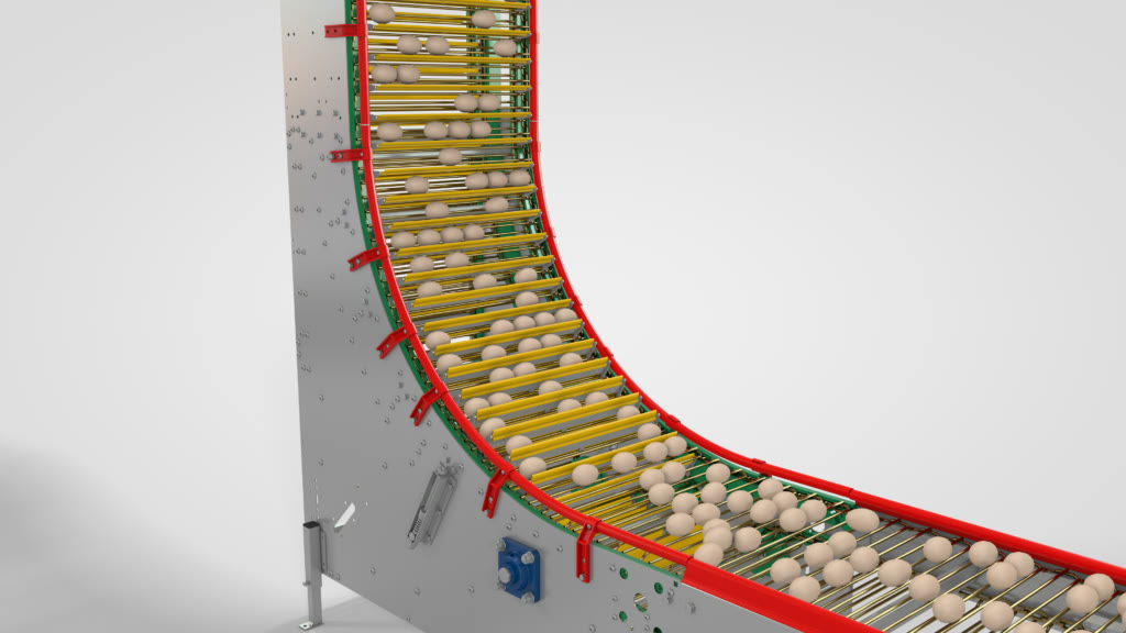 У другому радіусі вага яєць зміщується з елемента кріплення назад на стрижні конвеєрного ланцюга. Потім кріпильні елементи повільно витягуються вниз із ланцюга, і яйця повертаються на прути конвеєрного ланцюга в стабільному положенні.