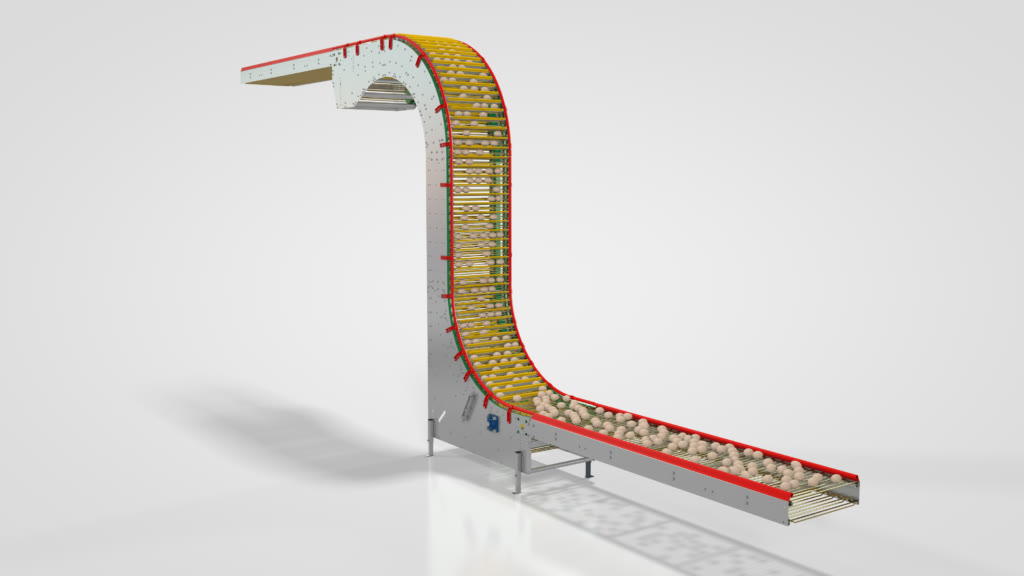 Елементи язика ланцюга конвеєра вертикального конвеєра ковзають у ланцюг конвеєра знизу незадовго до вертикального транспортування. Яйця повільно й обережно штовхають у положення для безпечного вертикального транспортування. По радіусу вага яєць переміщується від прутків конвеєрного ланцюга до елемента кріплення. У цьому положенні вертикальний конвеєр пропускається.